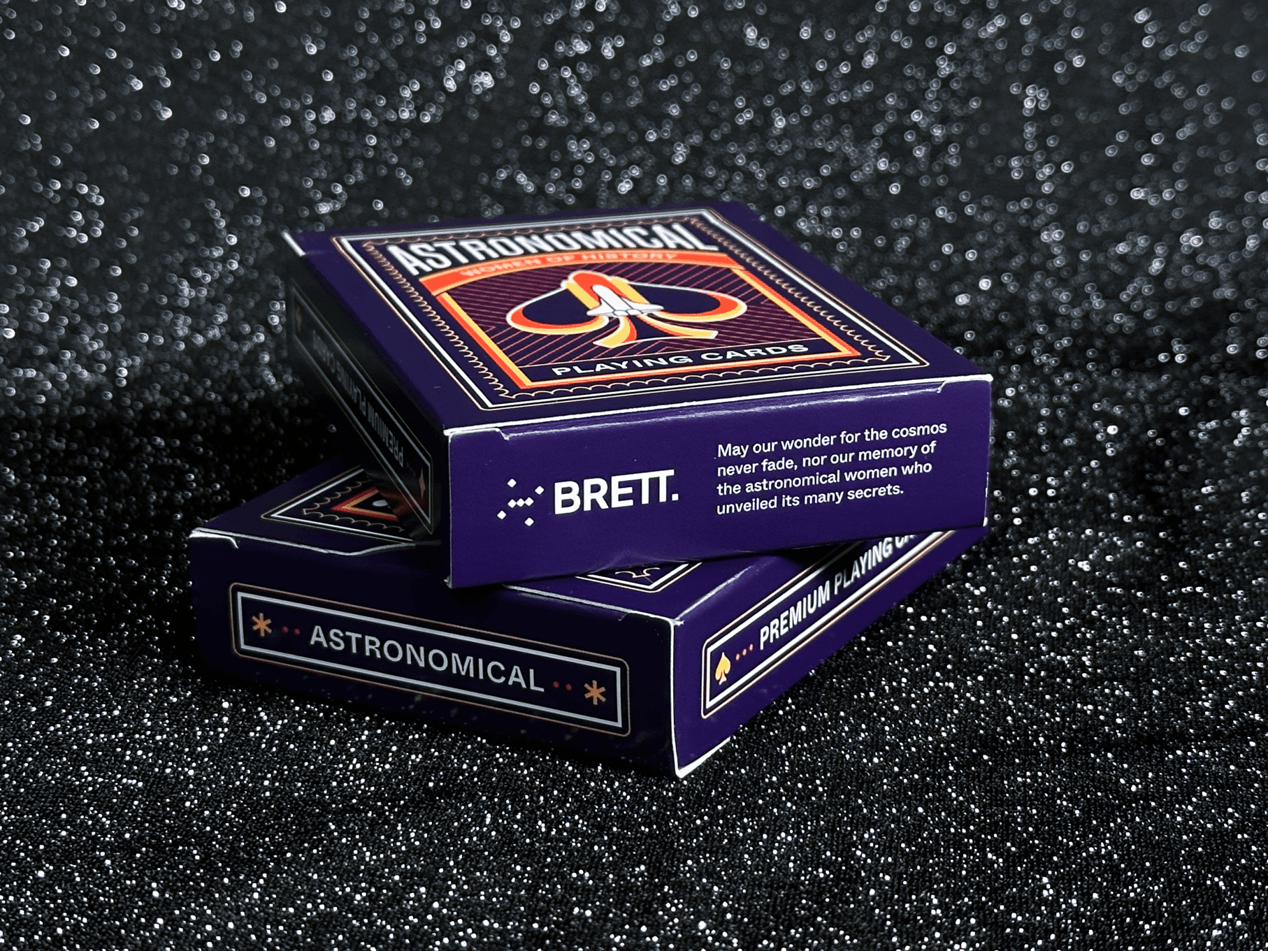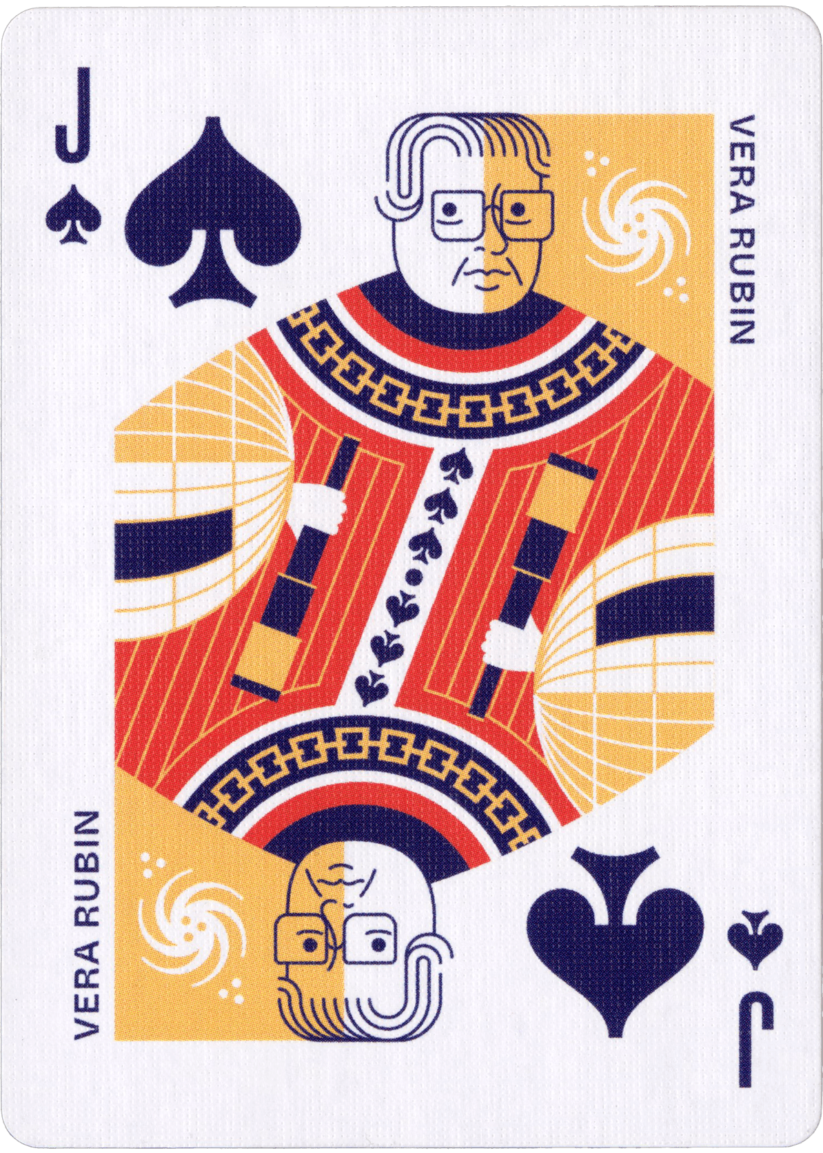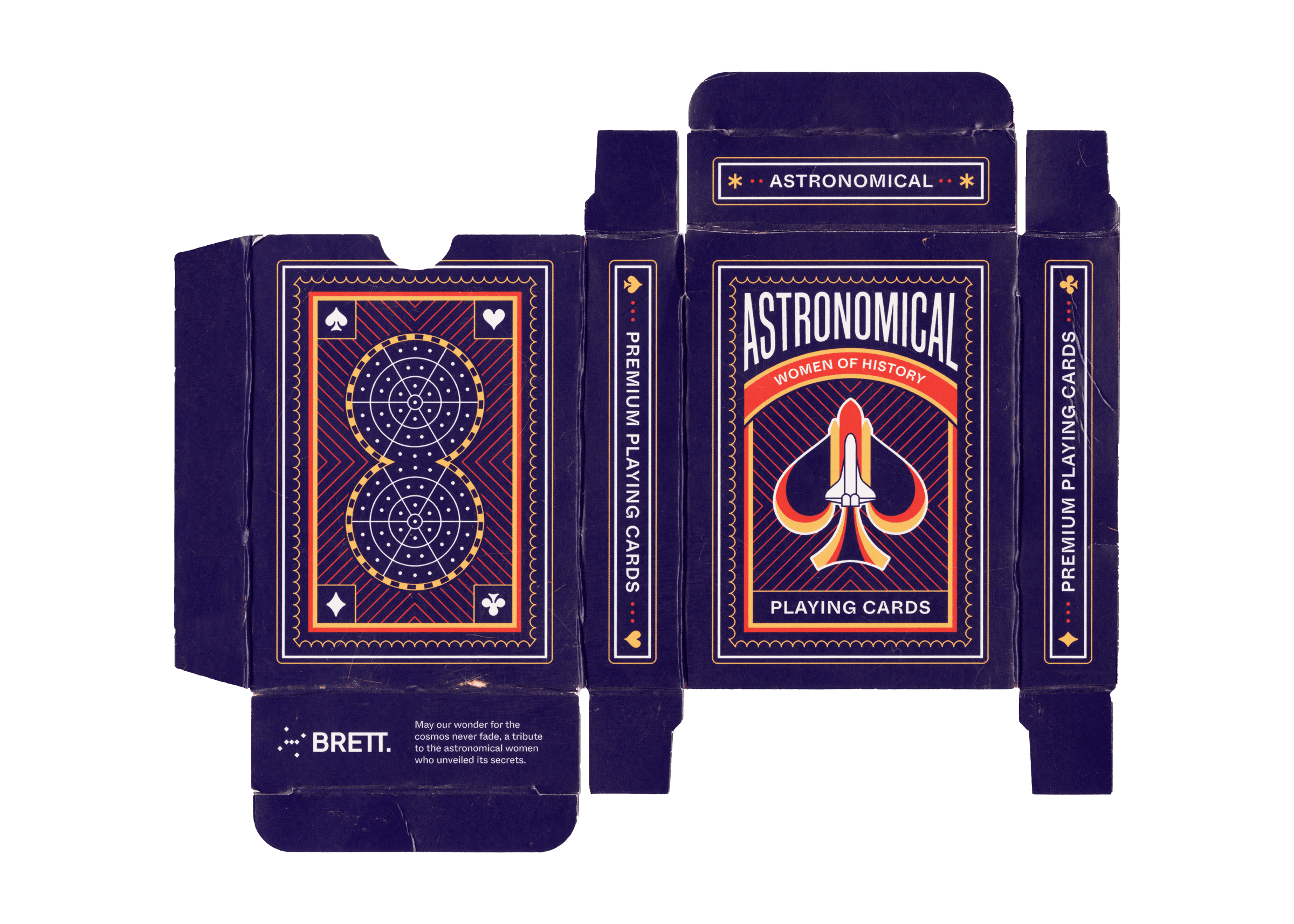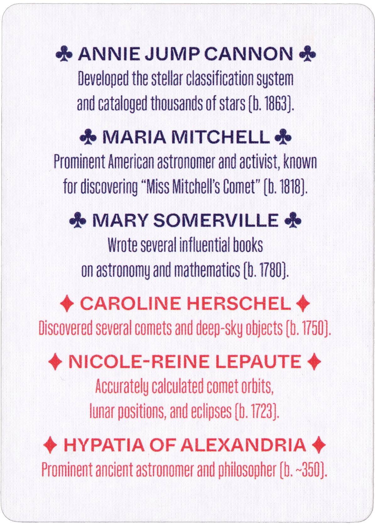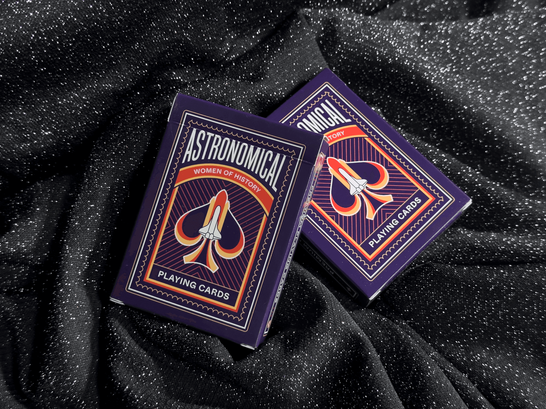 These premium playing cards are designed to celebrate some of the most influential women in the history of astronomy. Each meticulous illustration reflects the character and accomplishments of these remarkable pioneers. The cards come in a sturdy tuck box and are printed on casino style cardstock with a black core and air-cushion finish.