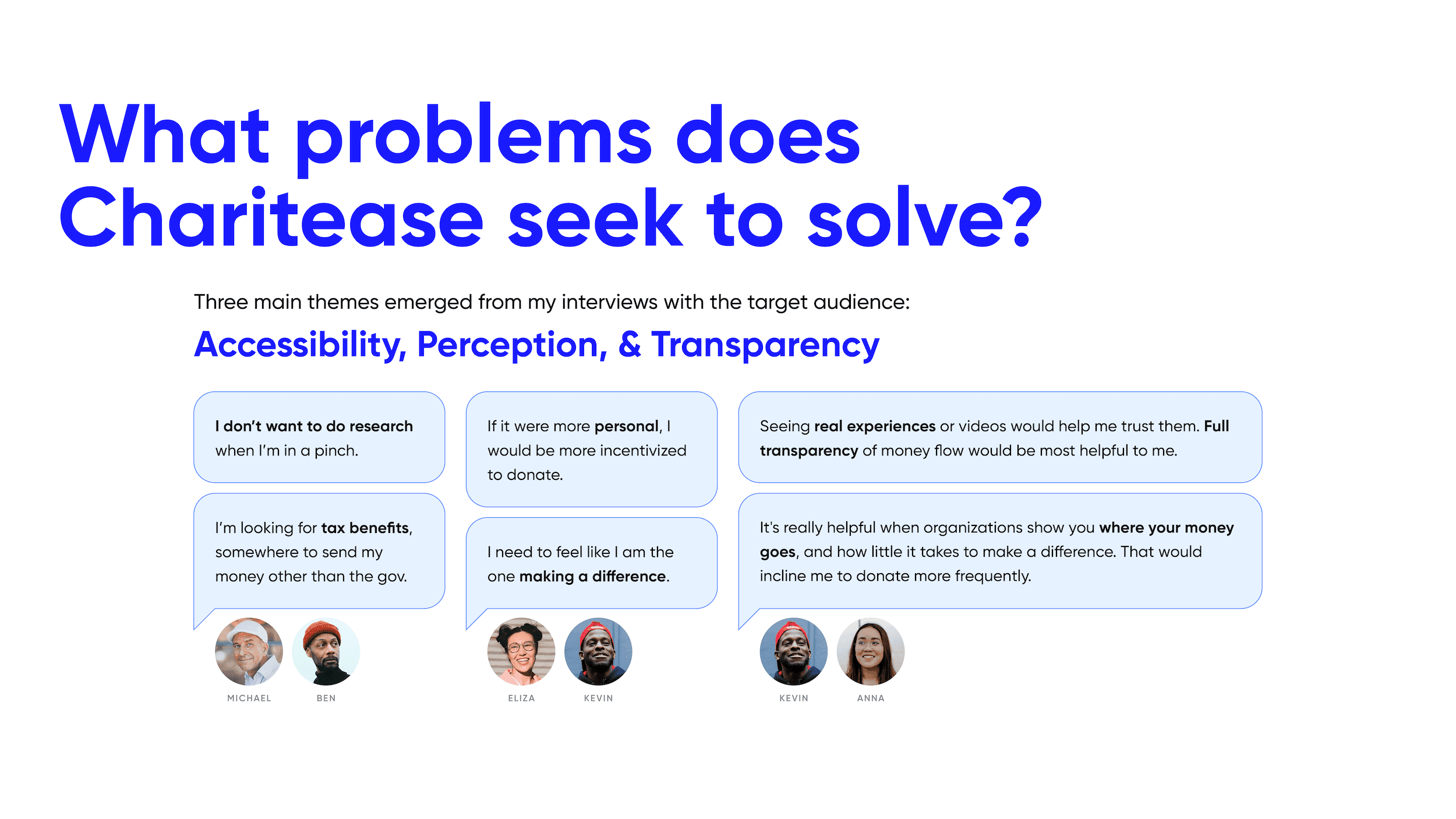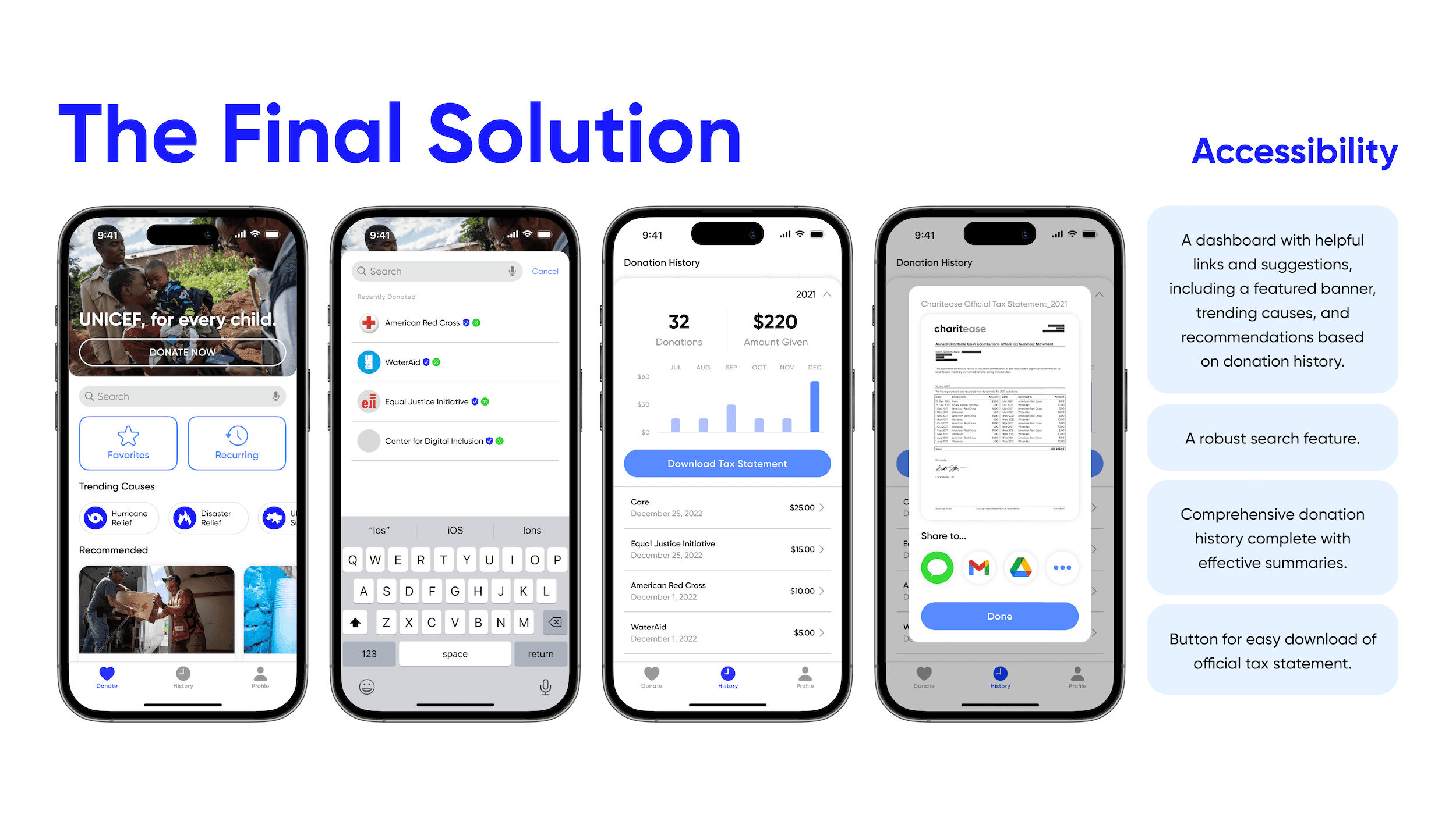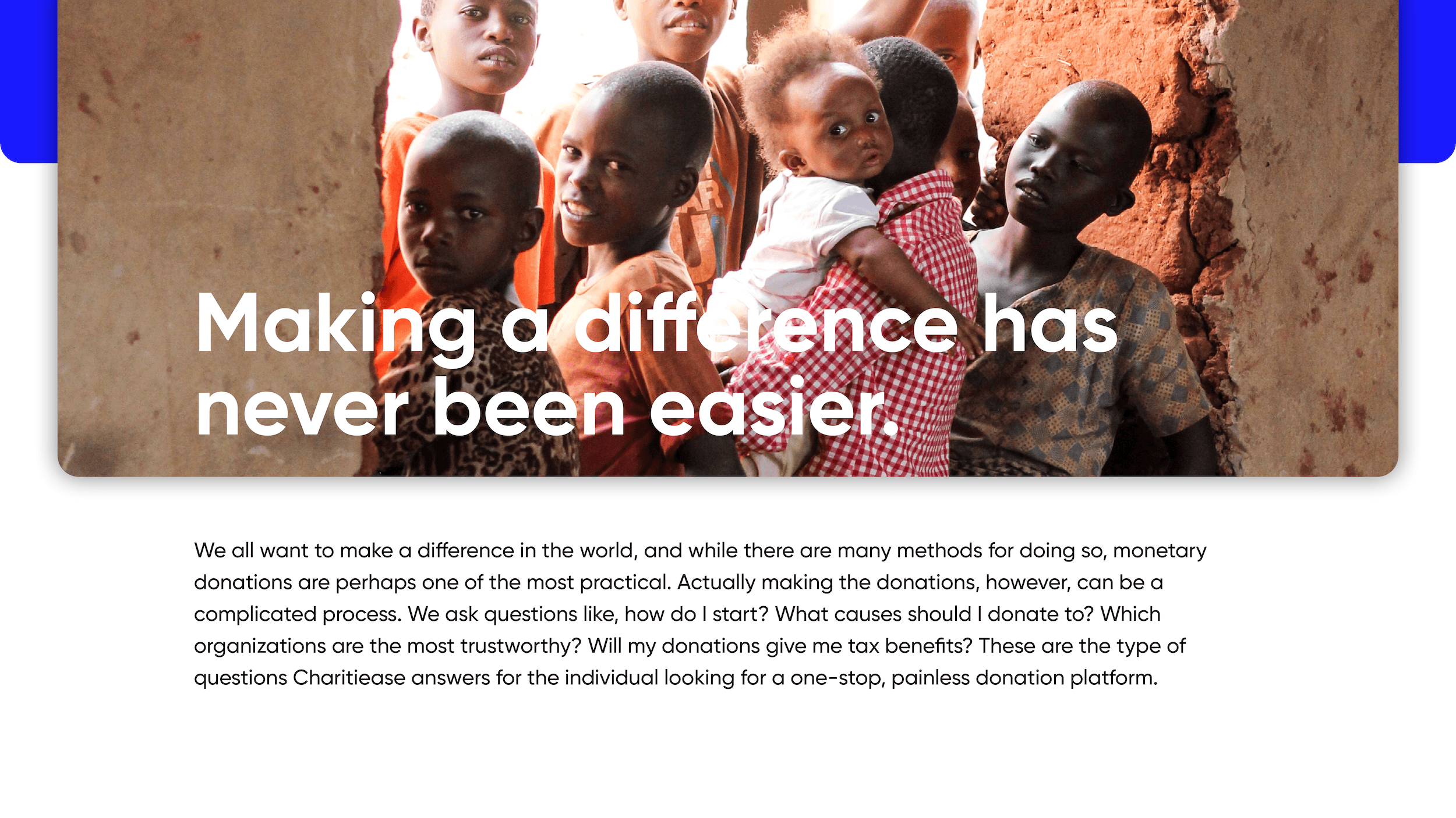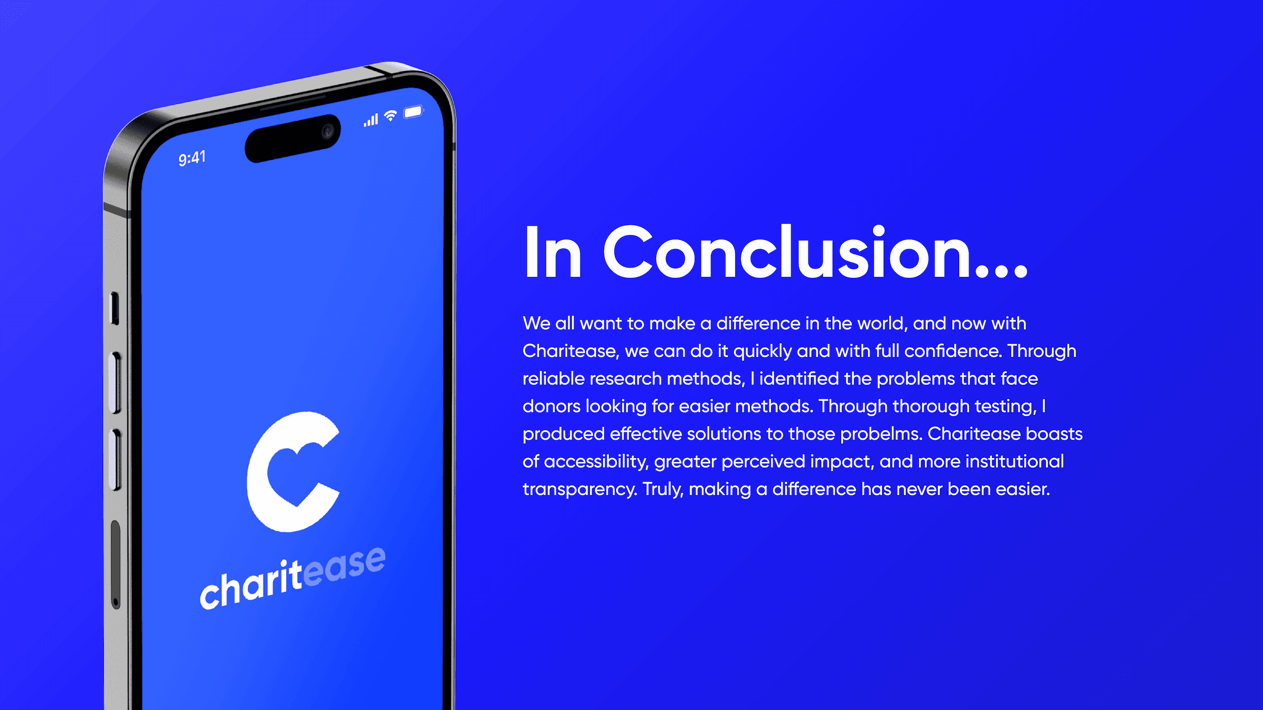 Charitease is a hypothetical mobile app that solves for three major roadblocks, preventing every day philanthropists: poor accessibility, lack of perceived impact, and trustworthiness of causes. The UI shines in this project, having been precisely designed with the user's experience and perception of the product in mind. It's the donating app that makes your desire to donate more attainable.