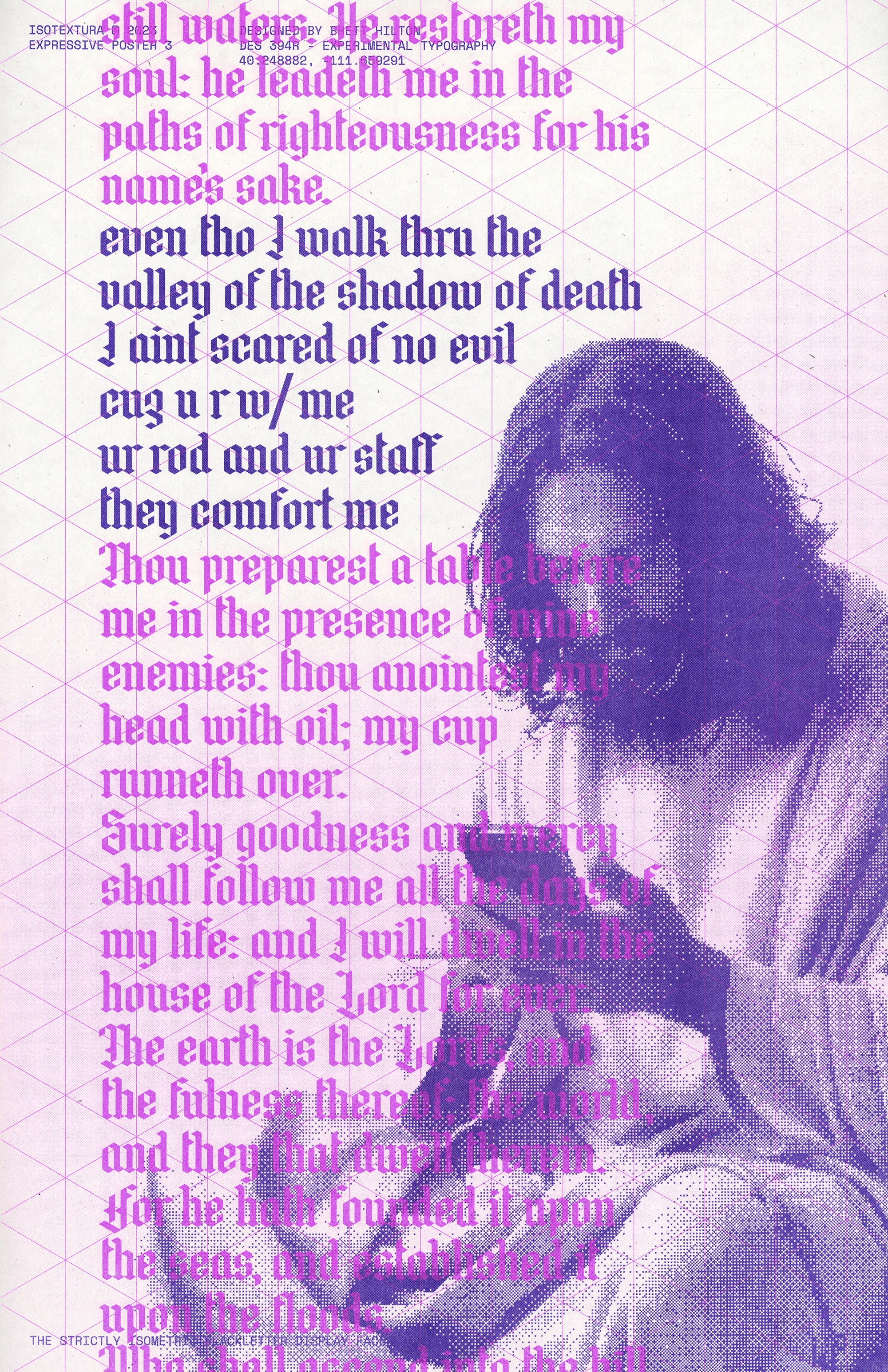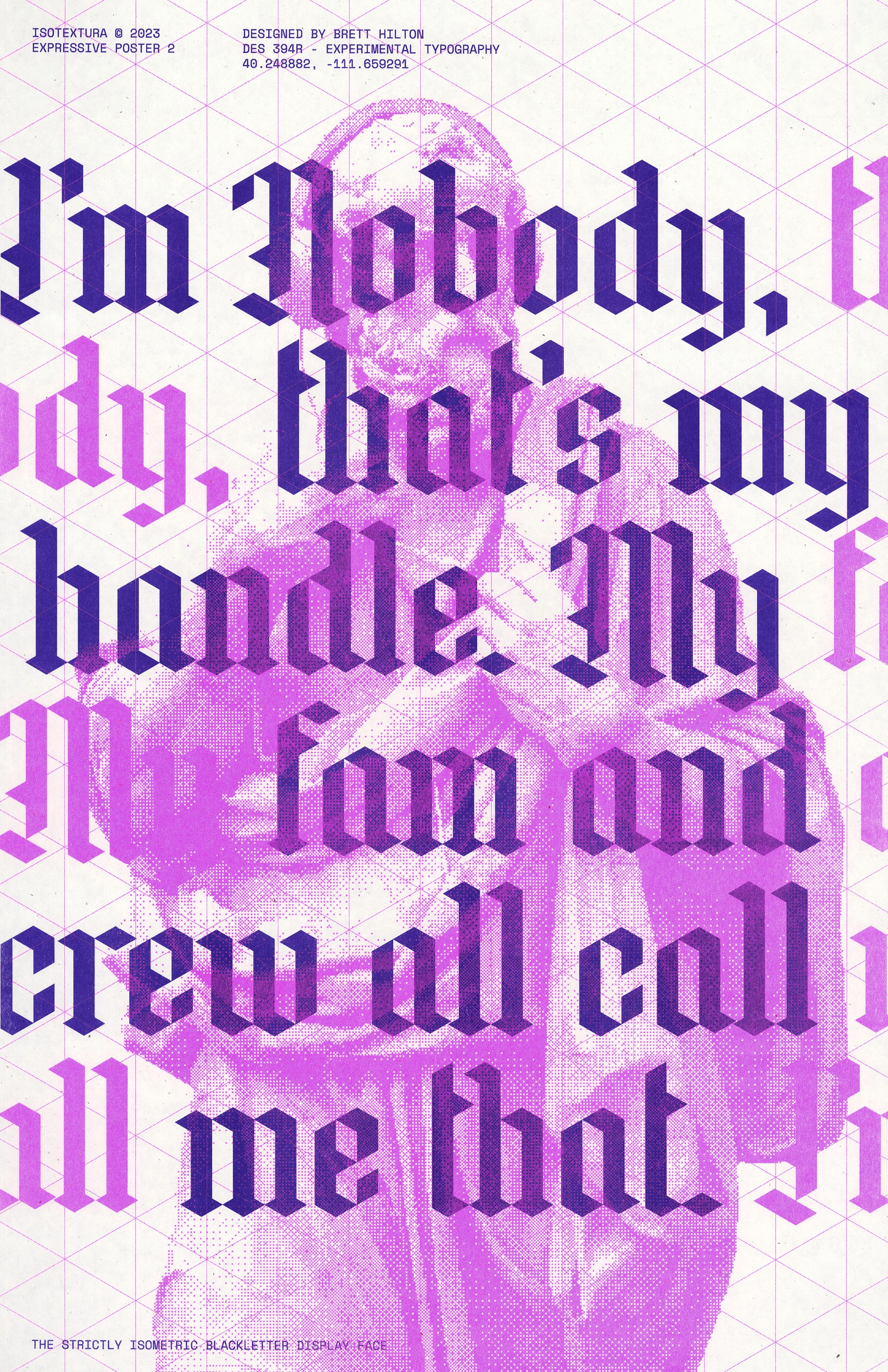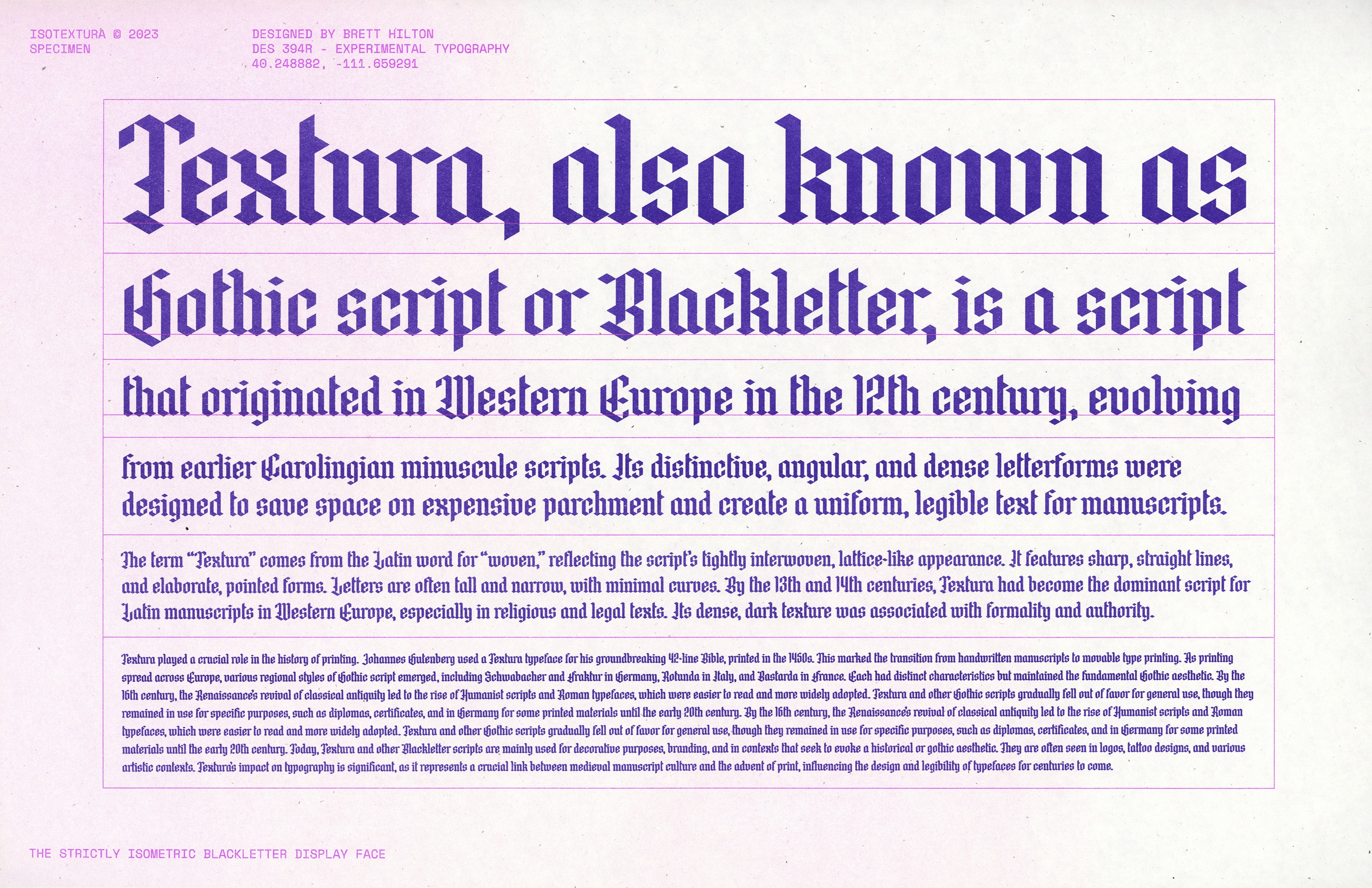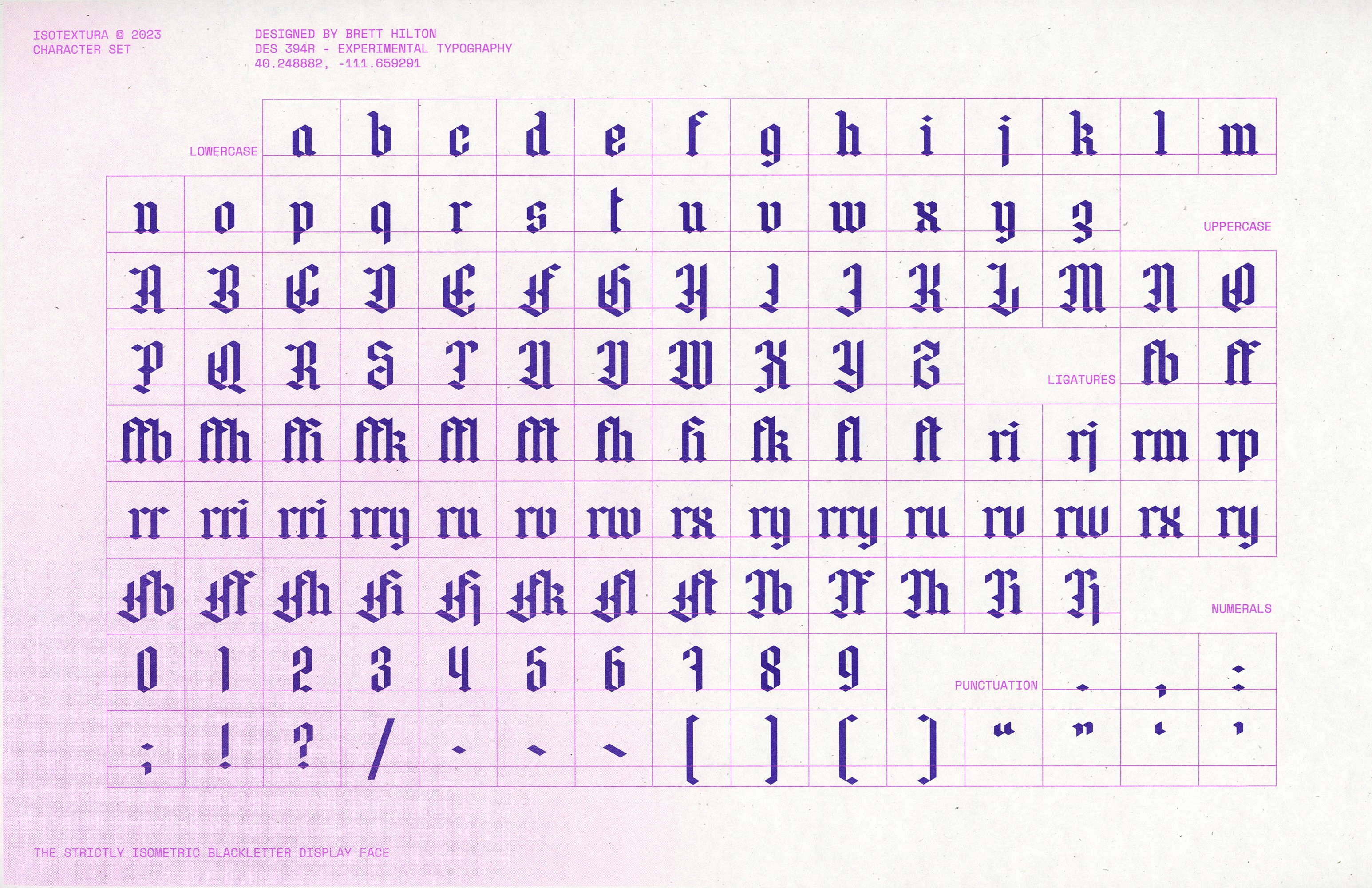 This original typeface is inspired by the earliest blackletter scripts often described as “textura,” but designed with one critical restraint: it was built entirely on an isometric grid. The letterforms follow a strict geometric logic that mirrors the flow of the calligraphic forms by which they were inspired.