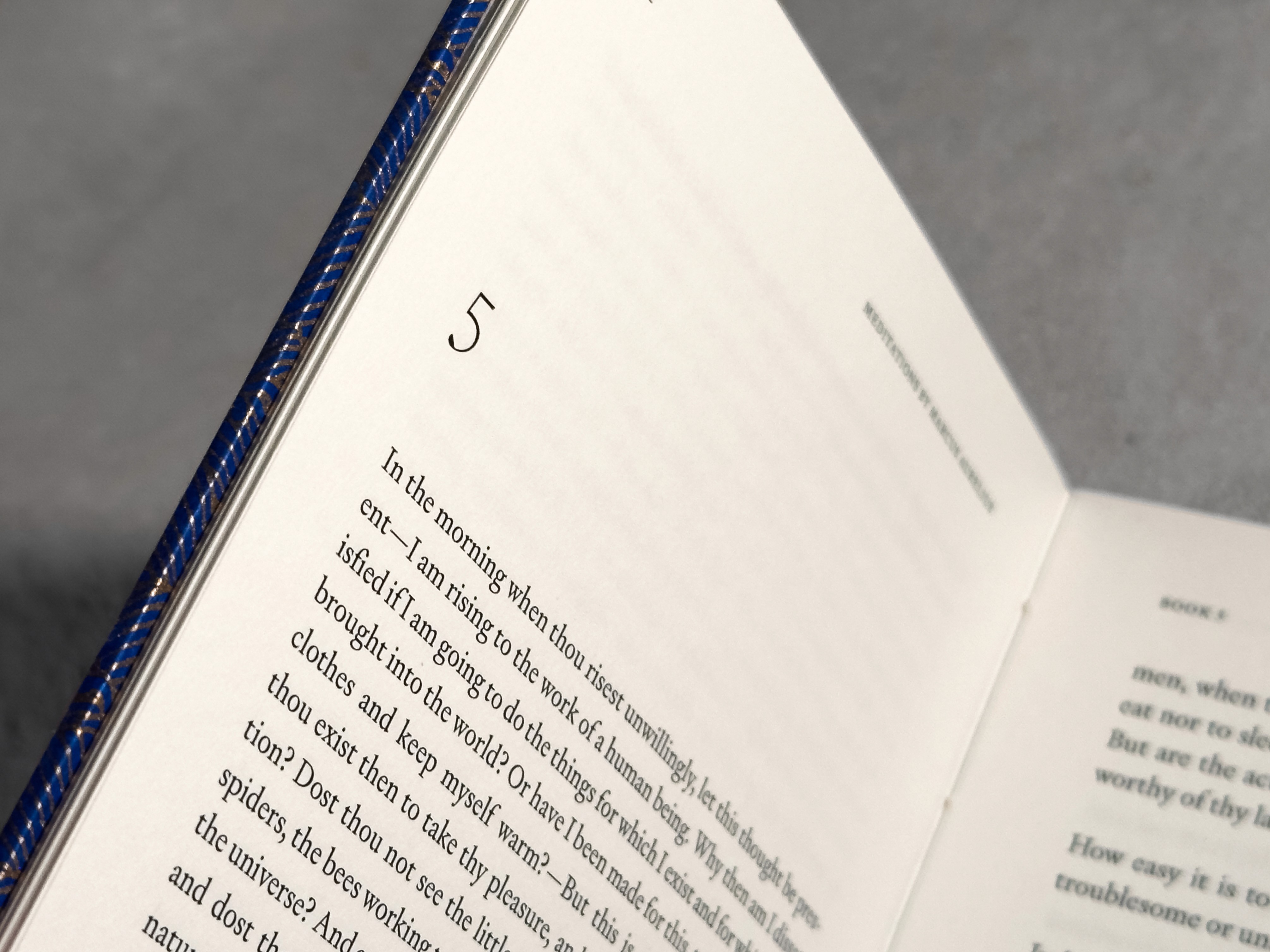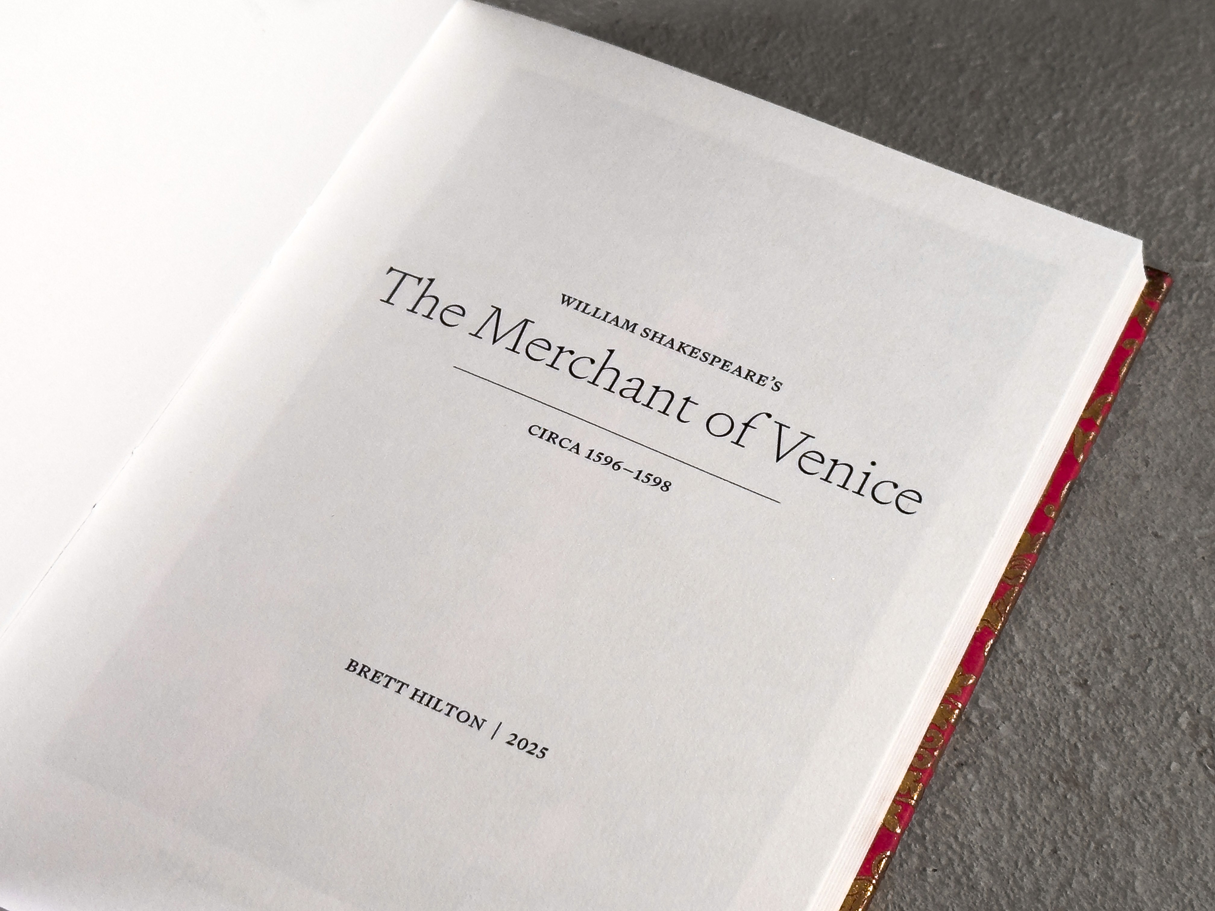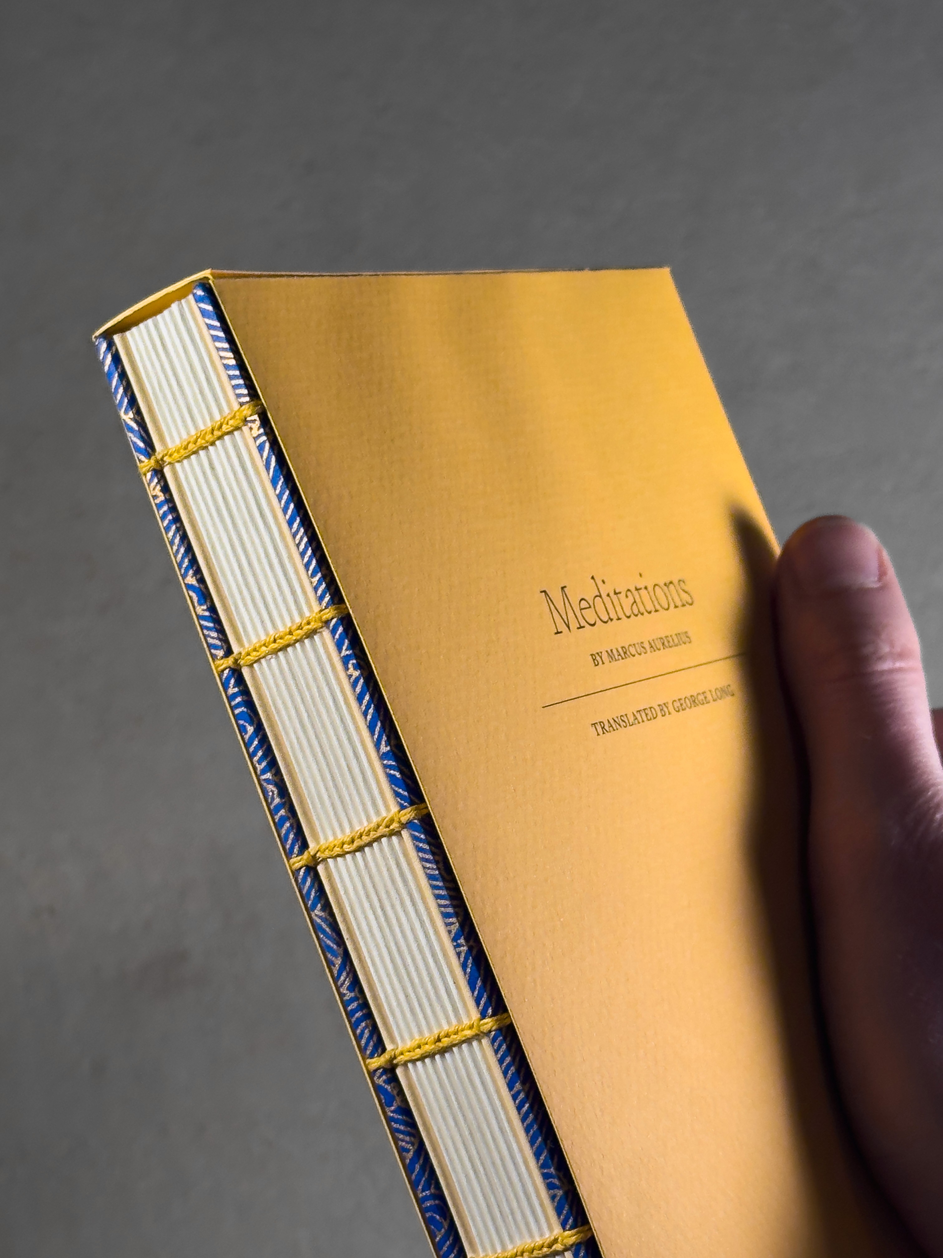 I bound a copy of Meditations by Marcus Aurelius and Shakespeare's The Merchant of Venice as Christmas gifts for my brother and sister-in-law respectively. Meditations was typeset exclusively in Signifier by Klim, and The Merchant of Venice was set in both Signifier and Crimson Pro. Both were printed on Stratford drawing paper with endpapers made of Canson ingres.