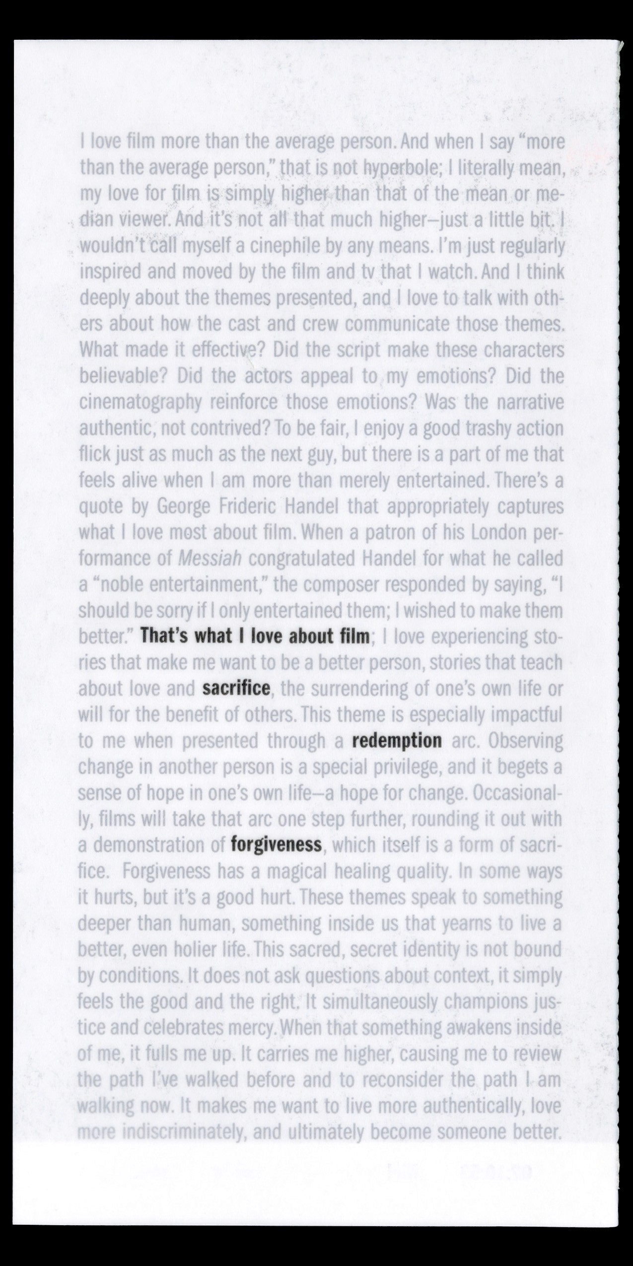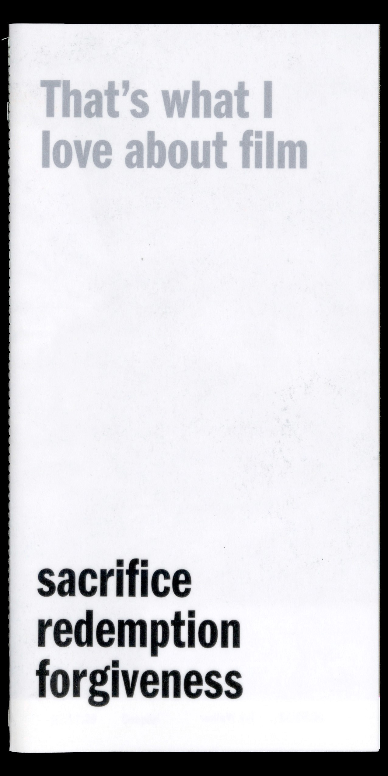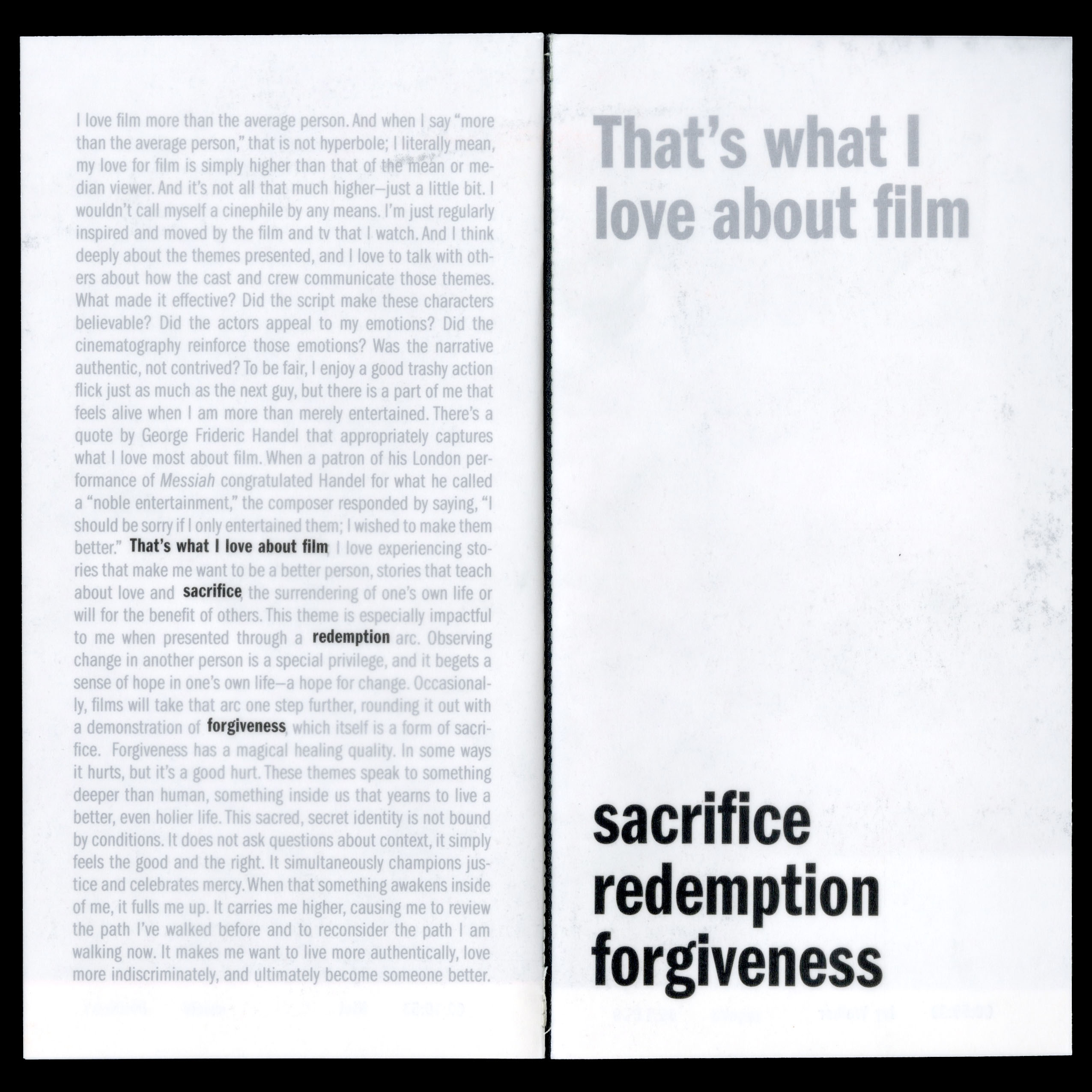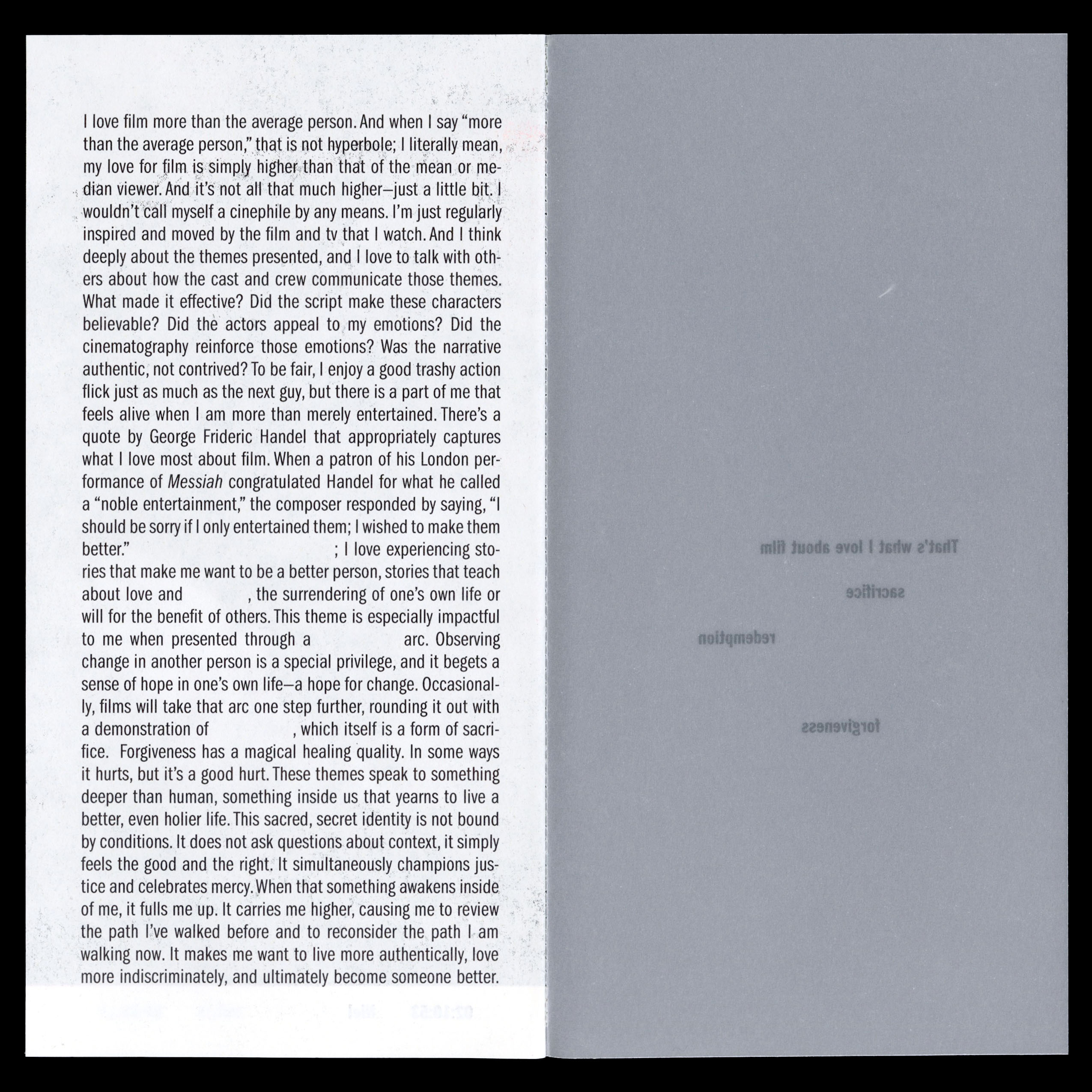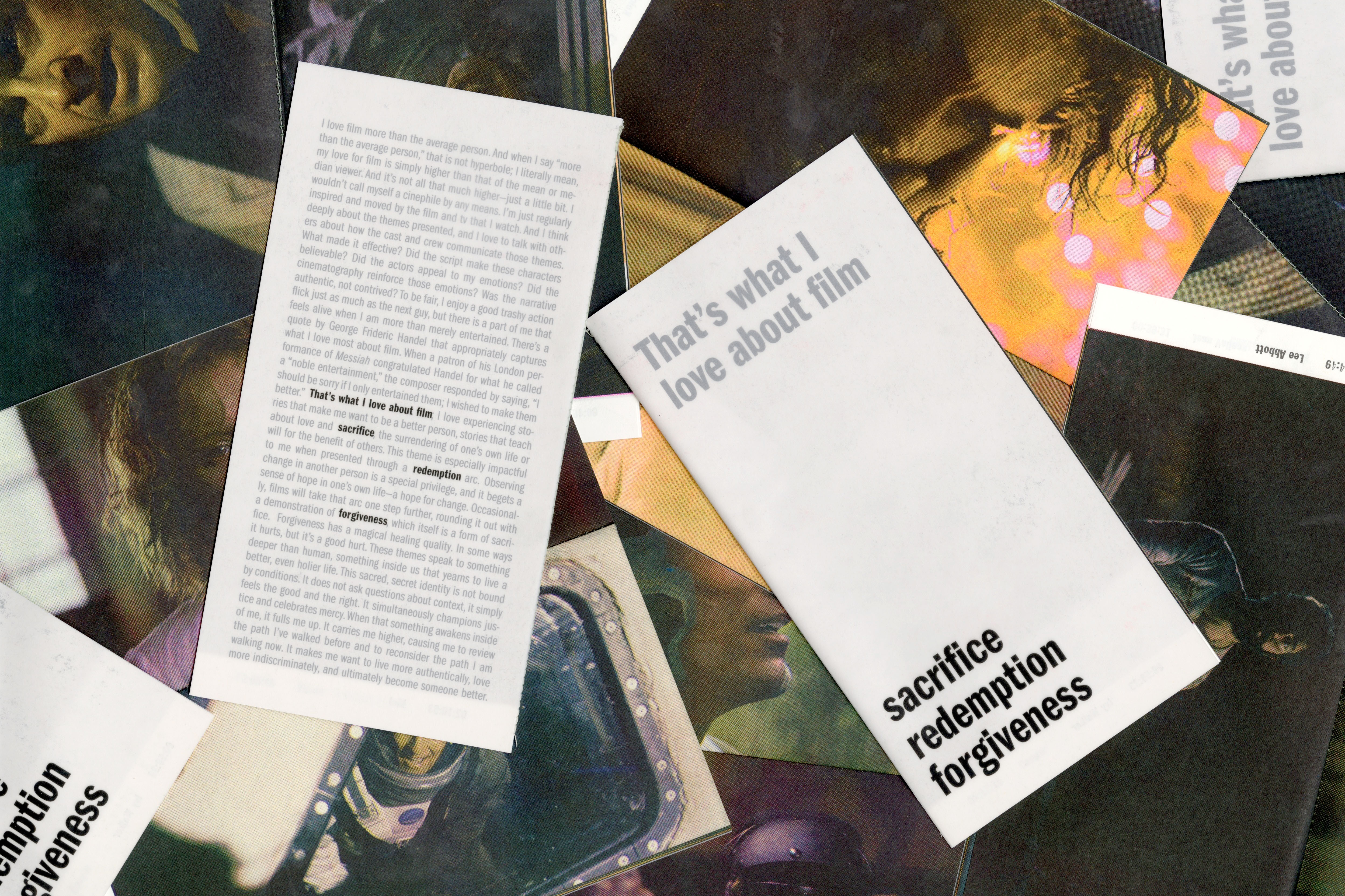 One of my favorite things in movies is seeing themes of sacrifice, redemption, and forgiveness. I find those kinds of stories extremely compelling. The stills featured in this zine are taken from movies or tv shows that demonstrate one of these themes. Each still is marked with a timestamp that indicates the pivotal moment when a key character makes their self-sacrificial decision or completes their redemption arc.