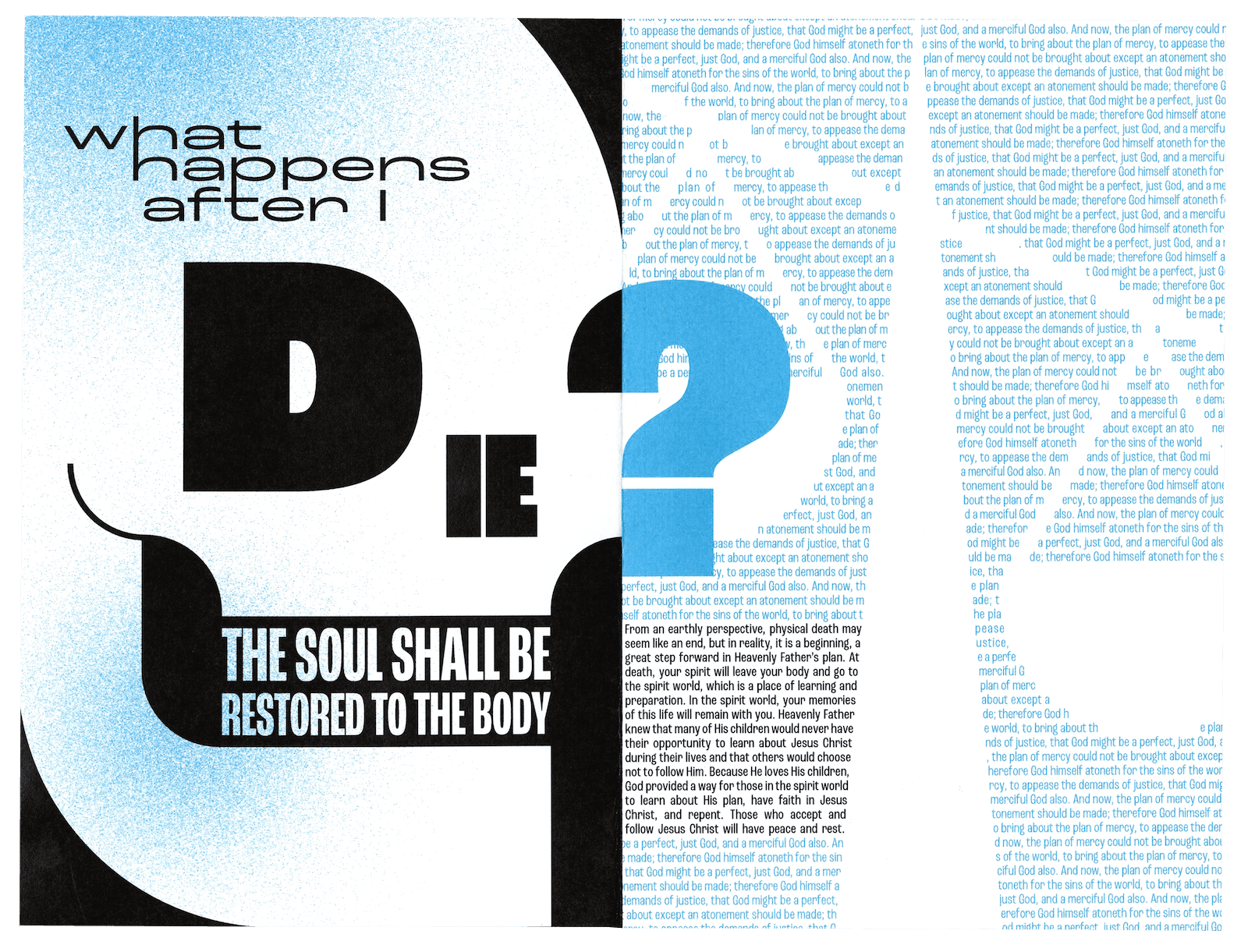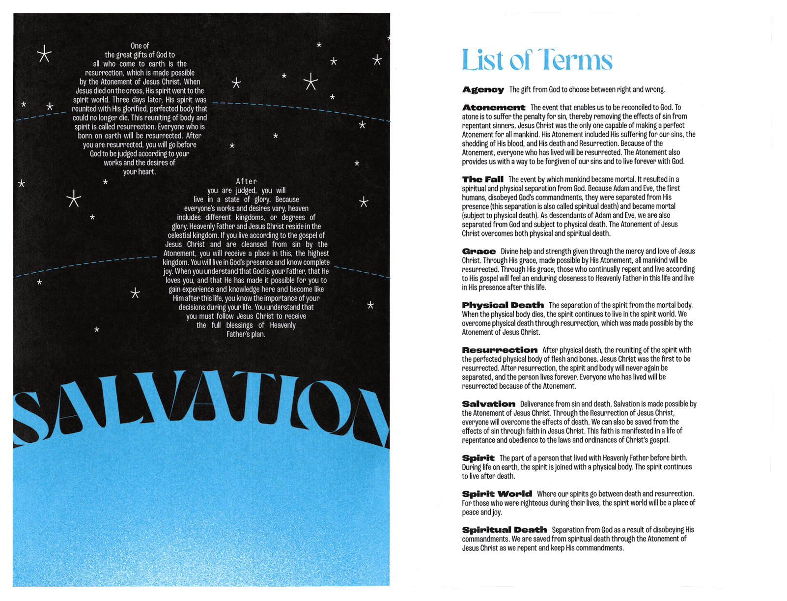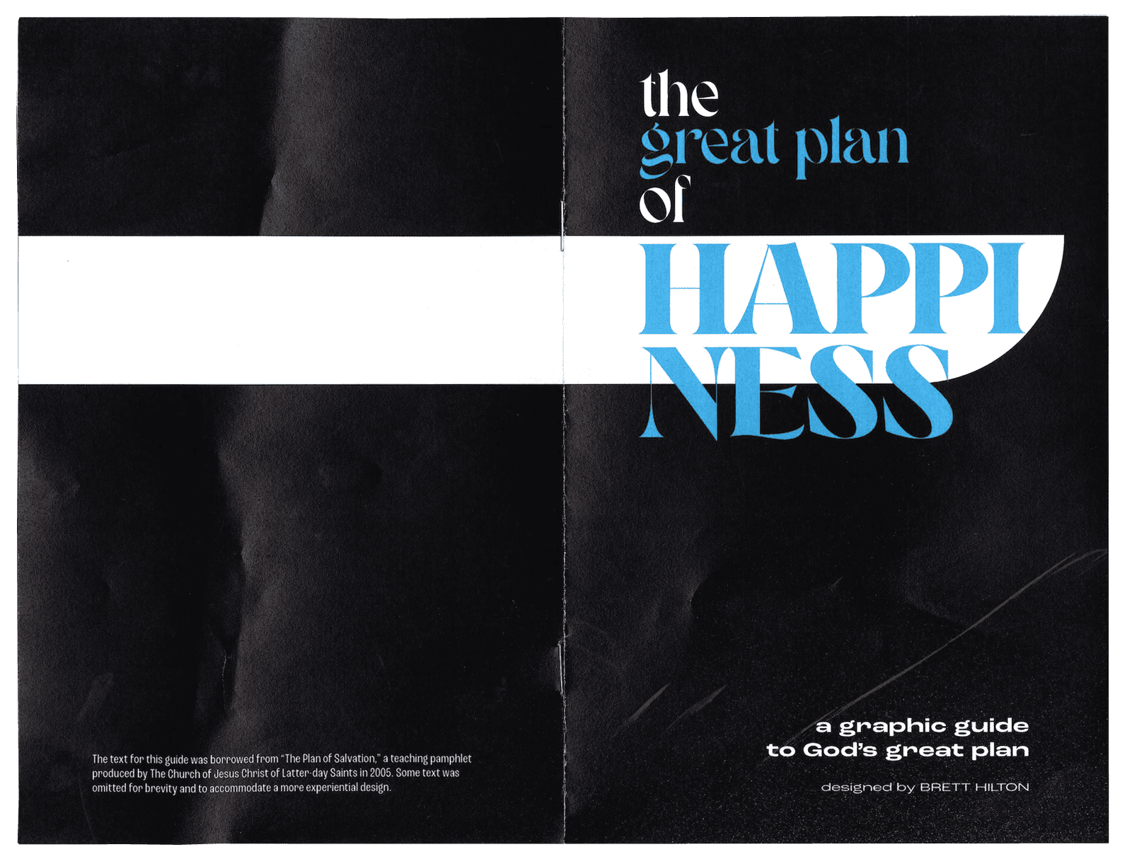 “The Great Plan of Happiness” is a graphic reimagining of the Church of Jesus Christ’s Plan of Salvation missionary pamphlet. The expressive type of each spread teaches the reader about God’s plan on an emotional level. Throughout the zine, pure cyan represents of the immense joy that a knowledge of God’s plan introduces into an otherwise dark and confusing world.