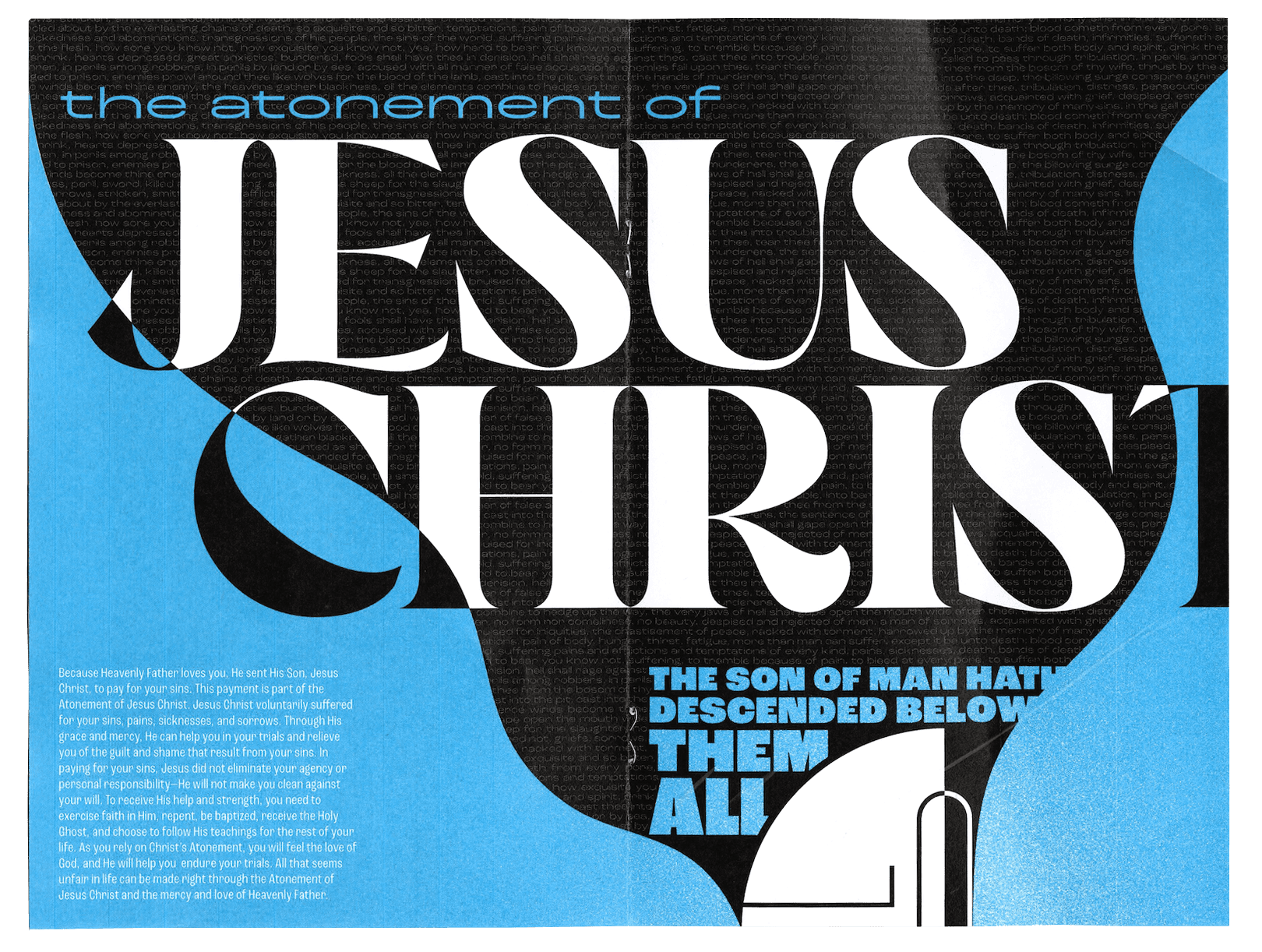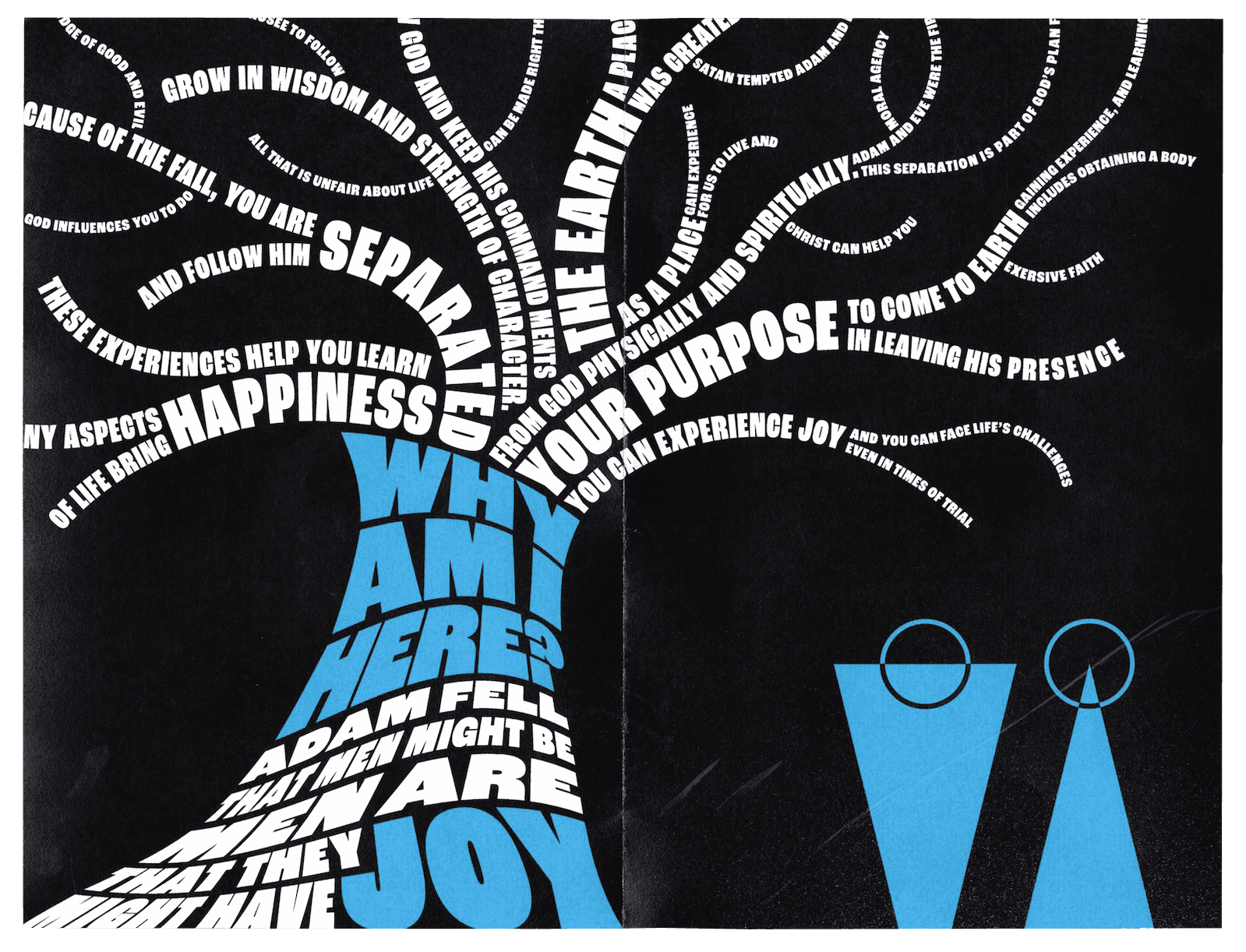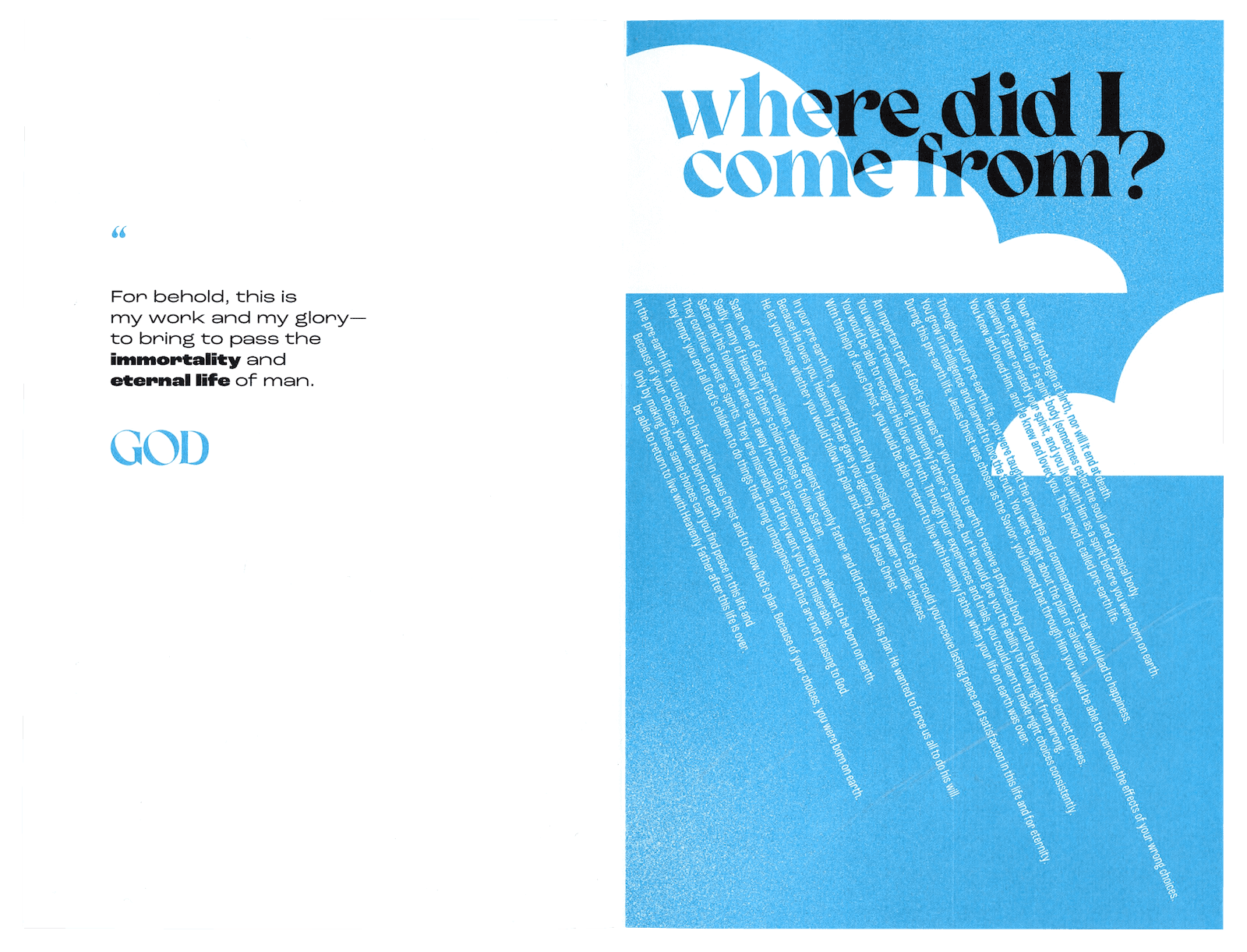 “The Great Plan of Happiness” is a graphic reimagining of the Church of Jesus Christ’s Plan of Salvation missionary pamphlet. The expressive type of each spread teaches the reader about God’s plan on an emotional level. Throughout the zine, pure cyan represents of the immense joy that a knowledge of God’s plan introduces into an otherwise dark and confusing world.