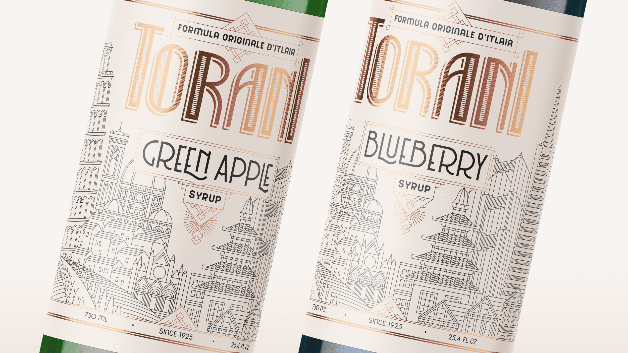 Torani was founded by Italian immigrants in San Francisco, a dual identity that I expressed by creating a detailed illustration with two halves, each representing iconic vistas of the Italian countryside and San Francisco cityscape. I wanted the packaging to evoke a feeling that represented the era of Torani’s inception, thus pulling a great deal of inspiration from the Art Deco movement.